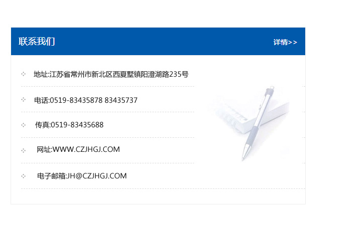 地址:常州市新北區友邦商務大廈1幢16、17層  電話:0519-85101652  傳真:0519-85112595  郵編:213022  網址:www.cz-jiayue_cn.hubeirenrbang.com  郵箱:xiajifengaa@163.com
